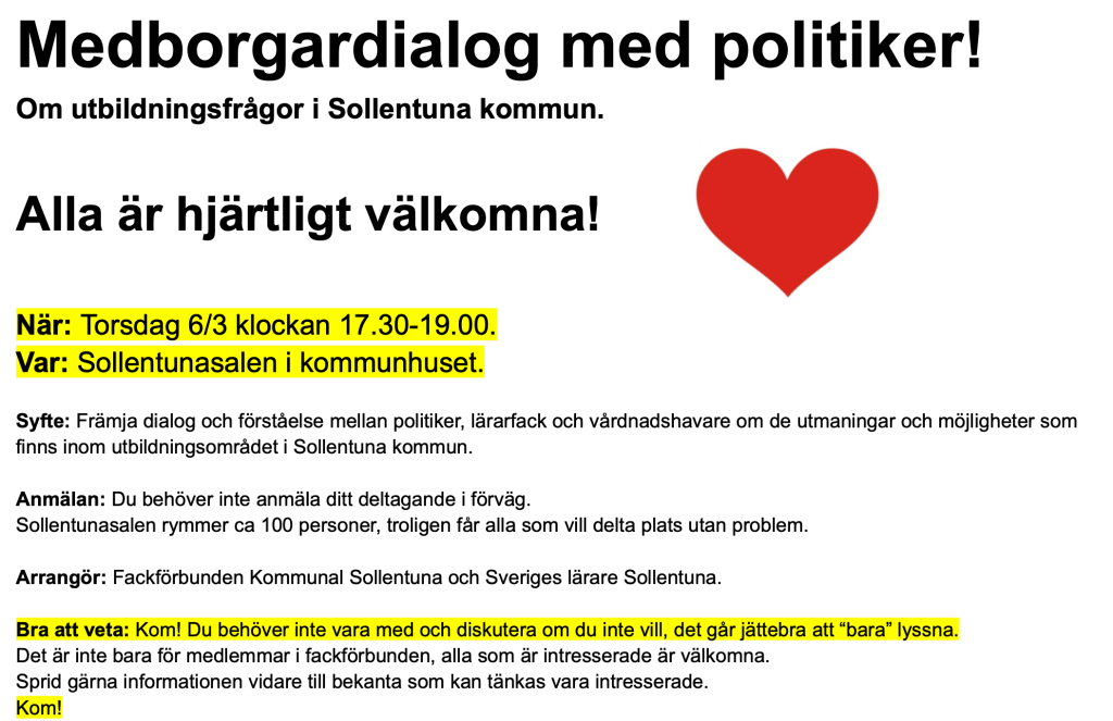 Arrangerades av fackförbunden Kommunal Sollentuna och Sveriges lärare Sollentuna, den 6/3 2025. Jag hade fått tillåtelse från arrangörerna att sprida information och bjuda in vårdnadshavare och andra intresserade.