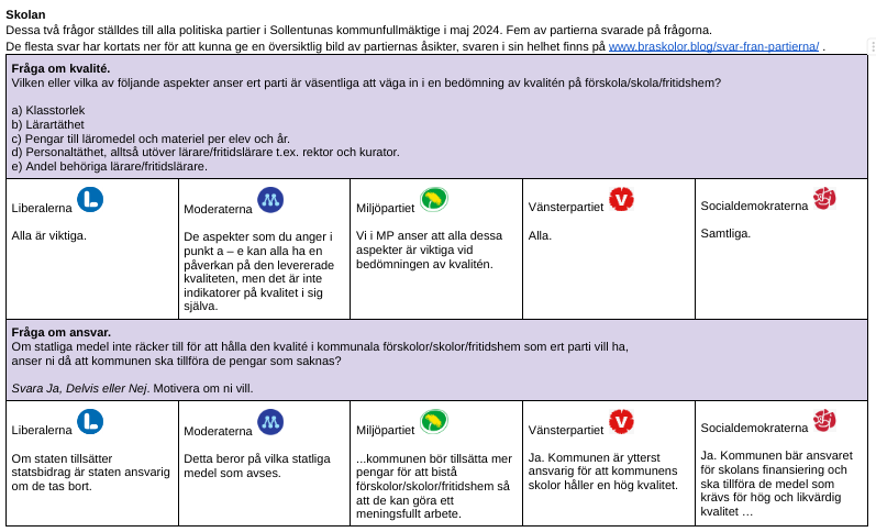 Svar från moderaterna: Sollentuna har en hög kvalitet i våra kommunala förskolor, skolor och fritidshem. Men vi kan aldrig vara nöjda, utan måste hela tiden sträva efter kontinuerlig förbättring och utveckling. Vi ska alltid jobba för att kvaliteten skall höjas i alla våra verksamheter.